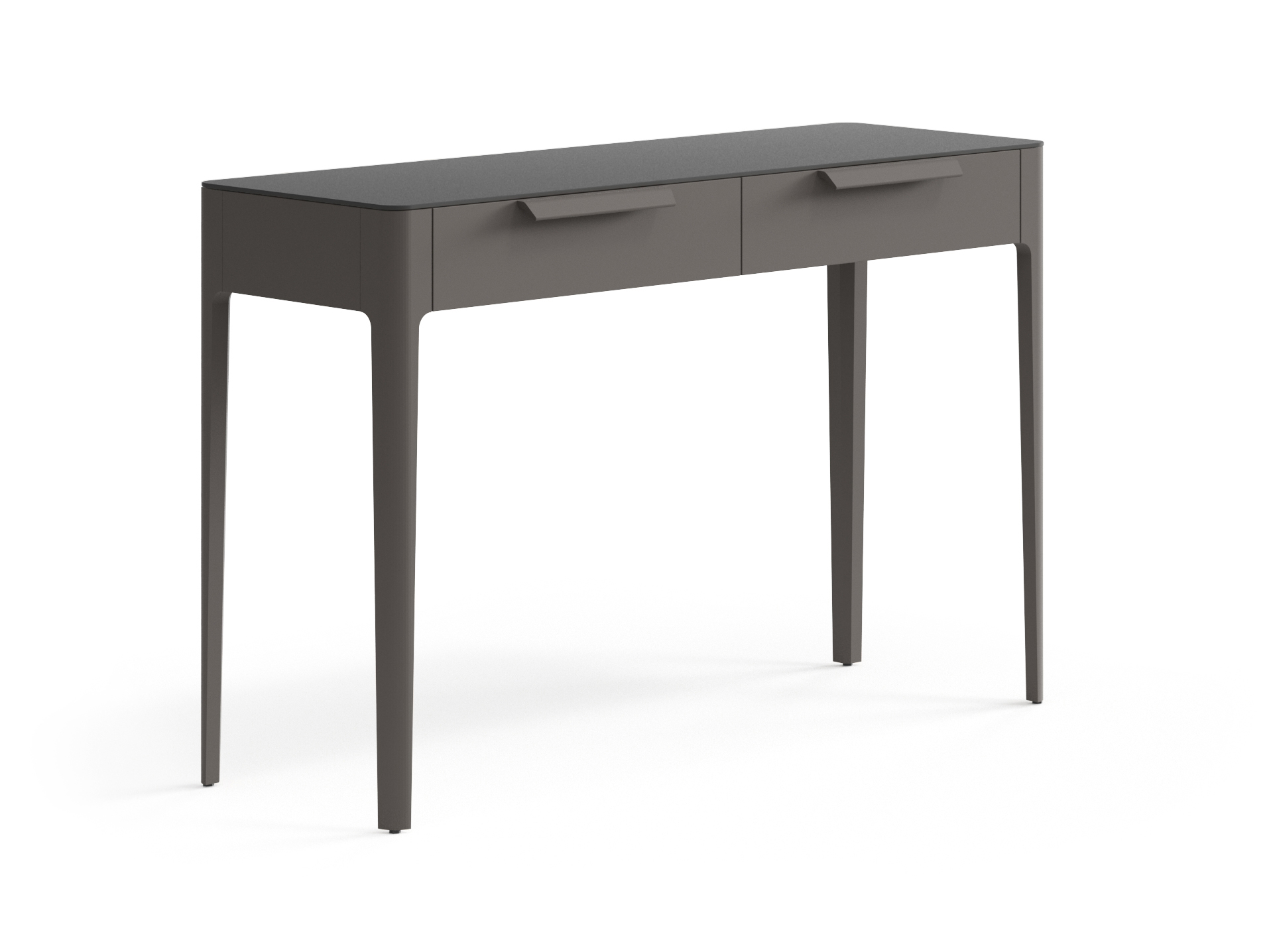 Консоль с двумя выдвижными ящиками на высоких элегантных опорах идеально впишется в любое помещение вашего дома и сделает его особенным. Изысканно сглаженные формы подчёркивают теплоту дерева, наполняют пространство природной гармонией. Скрытые направляющие ящиков с доводчиками и ручки в форме крыла делают пользование консолью мягким, уверенным и максимально комфортным. Столешница выполнена из керамогранита, крепкая поверхность приятна на вид и на ощупь. Ваза с букетом свежих цветов, любимые сборники литературы и тёплый торшер на консоли создадут истинный уют.