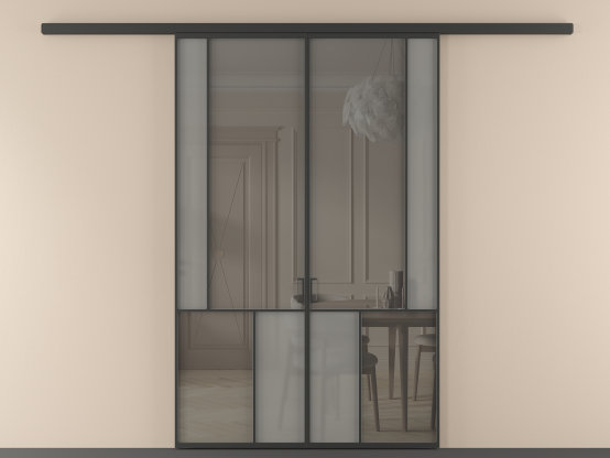 Во всех алюминиевых перегородках, независимо от типа установки, используется компланарный раздвижной механизм, благодаря которому декоративная крышка и полотно находятся в одной плоскости.