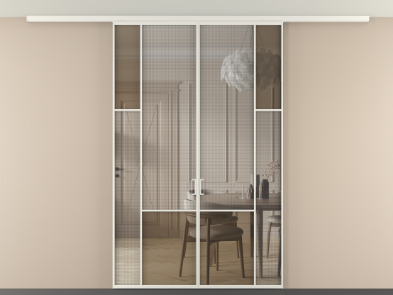 Во всех алюминиевых перегородках, независимо от типа установки, используется компланарный раздвижной механизм, благодаря которому декоративная крышка и полотно находятся в одной плоскости.