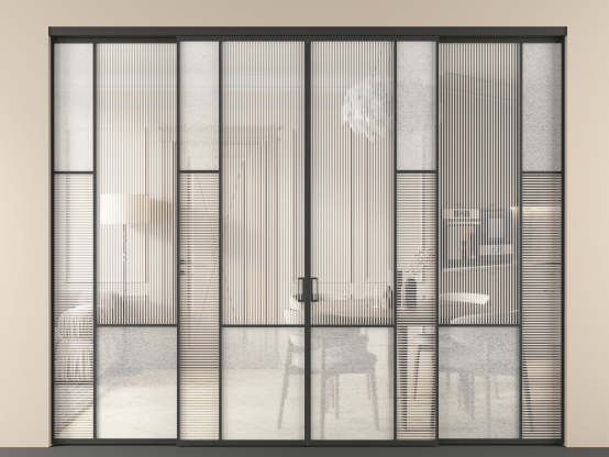 Во всех алюминиевых перегородках, независимо от типа установки, используется компланарный раздвижной механизм, благодаря которому декоративная крышка и полотно находятся в одной плоскости.