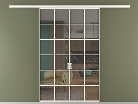 Во всех алюминиевых перегородках, независимо от типа установки, используется компланарный раздвижной механизм, благодаря которому декоративная крышка и полотно находятся в одной плоскости.