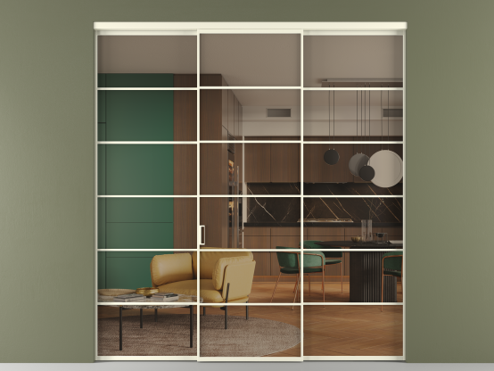 Алюминиевые перегородки имеют единый профиль с алюминиевыми дверьми и легко сочетаются в одном пространстве, не перегружая его. Также их можно комбинировать в интерьере с полотнами из нашего стандартного ассортимента. Помимо этого, система алюминиевых перегородок и дверей координируется со стеновыми панелями Волховец.