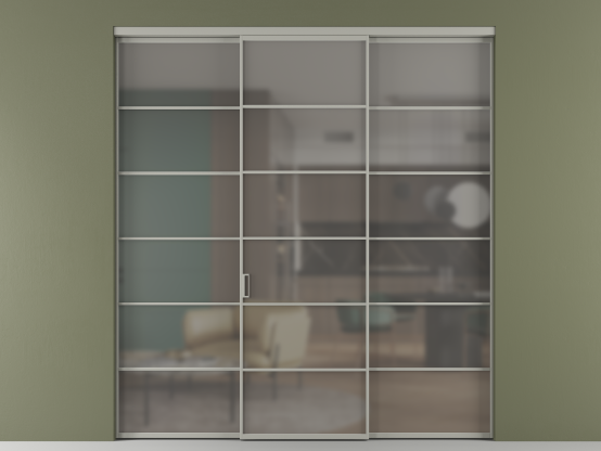 Во всех алюминиевых перегородках, независимо от типа установки, используется компланарный раздвижной механизм, благодаря которому декоративная крышка и полотно находятся в одной плоскости.