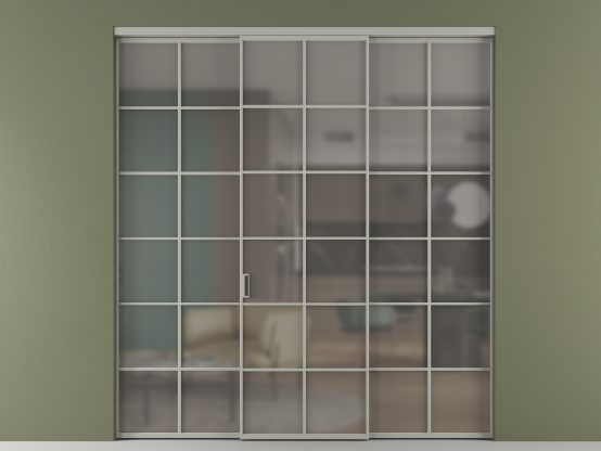 Во всех алюминиевых перегородках, независимо от типа установки, используется компланарный раздвижной механизм, благодаря которому декоративная крышка и полотно находятся в одной плоскости.