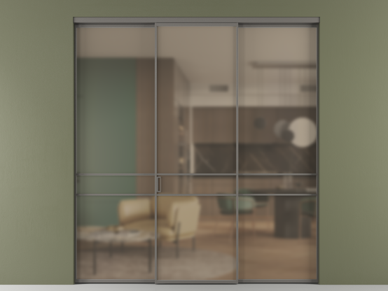 Во всех алюминиевых перегородках, независимо от типа установки, используется компланарный раздвижной механизм, благодаря которому декоративная крышка и полотно находятся в одной плоскости.