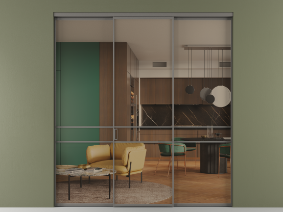 Алюминиевые перегородки имеют единый профиль с алюминиевыми дверьми и легко сочетаются в одном пространстве, не перегружая его. Также их можно комбинировать в интерьере с полотнами из нашего стандартного ассортимента. Помимо этого, система алюминиевых перегородок и дверей координируется со стеновыми панелями Волховец.