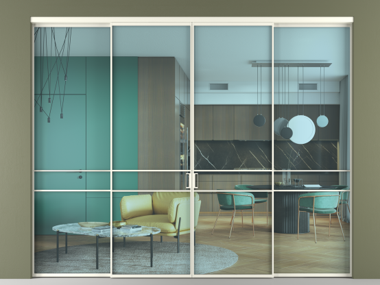 Во всех алюминиевых перегородках, независимо от типа установки, используется компланарный раздвижной механизм, благодаря которому декоративная крышка и полотно находятся в одной плоскости.