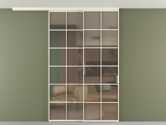 Во всех алюминиевых перегородках, независимо от типа установки, используется компланарный раздвижной механизм, благодаря которому декоративная крышка и полотно находятся в одной плоскости.