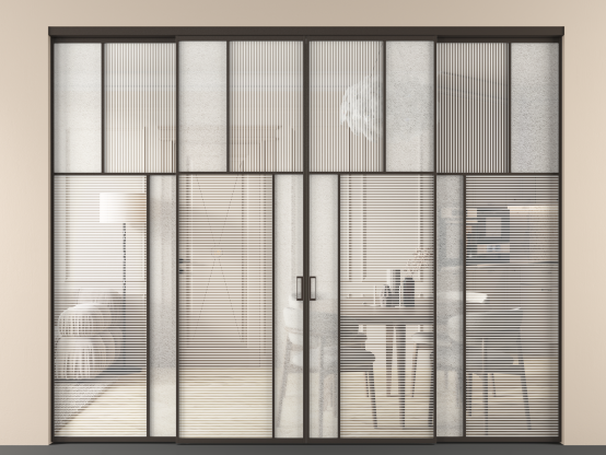 Во всех алюминиевых перегородках, независимо от типа установки, используется компланарный раздвижной механизм, благодаря которому декоративная крышка и полотно находятся в одной плоскости.