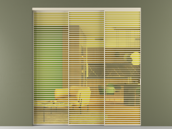 Дополнительно на раздвижную двустворчатую перегородку вдоль стены и четырёхстворчатую перегородку внутри проёма с двумя неподвижным полотнами можно установить механизм синхронного открывания — при открывании одной створки, вторая открывается автоматически.