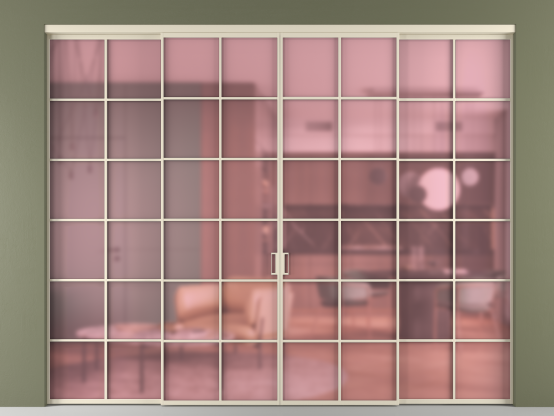 Дополнительно на раздвижную двустворчатую перегородку вдоль стены и четырёхстворчатую перегородку внутри проёма с двумя неподвижным полотнами можно установить механизм синхронного открывания — при открывании одной створки, вторая открывается автоматически.