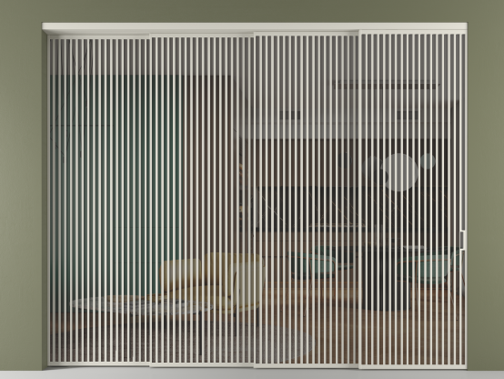 Во всех алюминиевых перегородках, независимо от типа установки, используется компланарный раздвижной механизм, благодаря которому декоративная крышка и полотно находятся в одной плоскости.