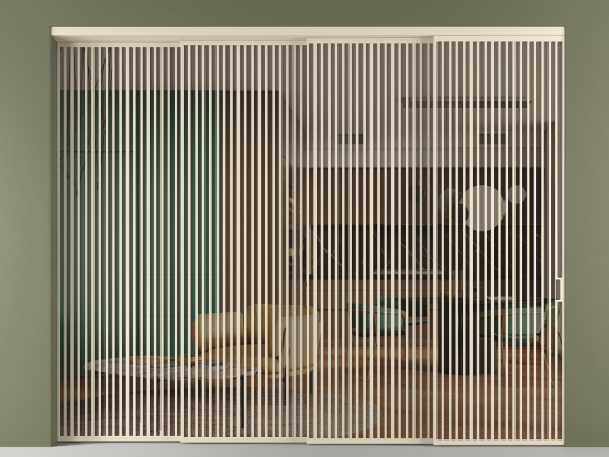 Дополнительно на раздвижную двустворчатую перегородку вдоль стены и четырёхстворчатую перегородку внутри проёма с двумя неподвижным полотнами можно установить механизм синхронного открывания — при открывании одной створки, вторая открывается автоматически.