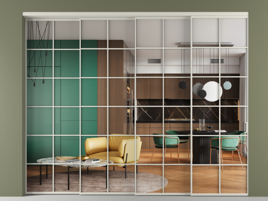 Алюминиевые перегородки имеют единый профиль с алюминиевыми дверьми и легко сочетаются в одном пространстве, не перегружая его. Также их можно комбинировать в интерьере с полотнами из нашего стандартного ассортимента. Помимо этого, система алюминиевых перегородок и дверей координируется со стеновыми панелями Волховец.