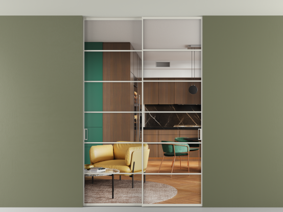 Алюминиевые перегородки имеют единый профиль с алюминиевыми дверьми и легко сочетаются в одном пространстве, не перегружая его. Также их можно комбинировать в интерьере с полотнами из нашего стандартного ассортимента. Помимо этого, система алюминиевых перегородок и дверей координируется со стеновыми панелями Волховец.