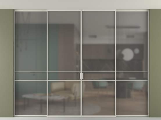 Во всех алюминиевых перегородках, независимо от типа установки, используется компланарный раздвижной механизм, благодаря которому декоративная крышка и полотно находятся в одной плоскости.