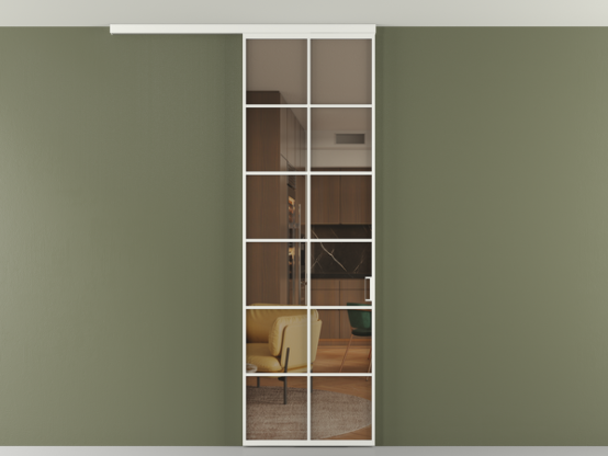 Во всех алюминиевых перегородках, независимо от типа установки, используется компланарный раздвижной механизм, благодаря которому декоративная крышка и полотно находятся в одной плоскости.
