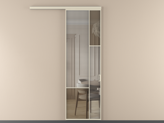 Во всех алюминиевых перегородках, независимо от типа установки, используется компланарный раздвижной механизм, благодаря которому декоративная крышка и полотно находятся в одной плоскости.
