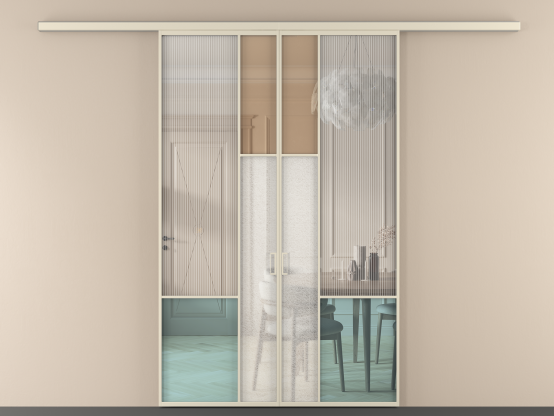 Дополнительно на раздвижную двустворчатую перегородку вдоль стены и четырехстворчатую перегородку внутри проема с двумя неподвижным полотнами можно установить механизм синхронного открывания — при открывании одной створки, вторая открывается автоматически.
