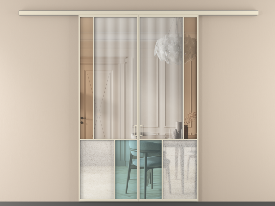 Во всех алюминиевых перегородках, независимо от типа установки, используется компланарный раздвижной механизм, благодаря которому декоративная крышка и полотно находятся в одной плоскости.