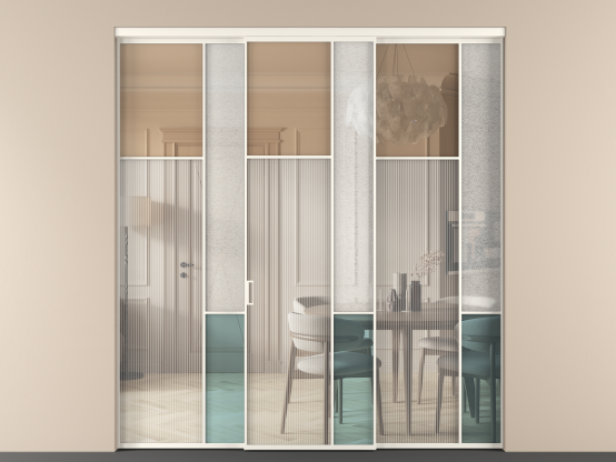 Дополнительно на раздвижную двустворчатую перегородку вдоль стены и четырехстворчатую перегородку внутри проема с двумя неподвижным полотнами можно установить механизм синхронного открывания — при открывании одной створки, вторая открывается автоматически.
