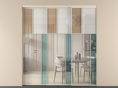 Дополнительно на раздвижную двустворчатую перегородку вдоль стены и четырехстворчатую перегородку внутри проема с двумя неподвижным полотнами можно установить механизм синхронного открывания — при открывании одной створки, вторая открывается автоматически.