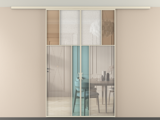 Дополнительно на раздвижную двустворчатую перегородку вдоль стены и четырехстворчатую перегородку внутри проема с двумя неподвижным полотнами можно установить механизм синхронного открывания — при открывании одной створки, вторая открывается автоматически.